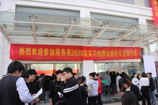 大学时光飞逝,2017级的学生转眼间又到了离校实习阶段。为了丰富同学们的社会实践经验,也为我校毕业生跟岗实习和就业提供更加全面有效的服务,商务系与应用语言系于2019年10月31号下午在行政楼大厅共同举办了2020届毕业生跟岗实习招聘会。