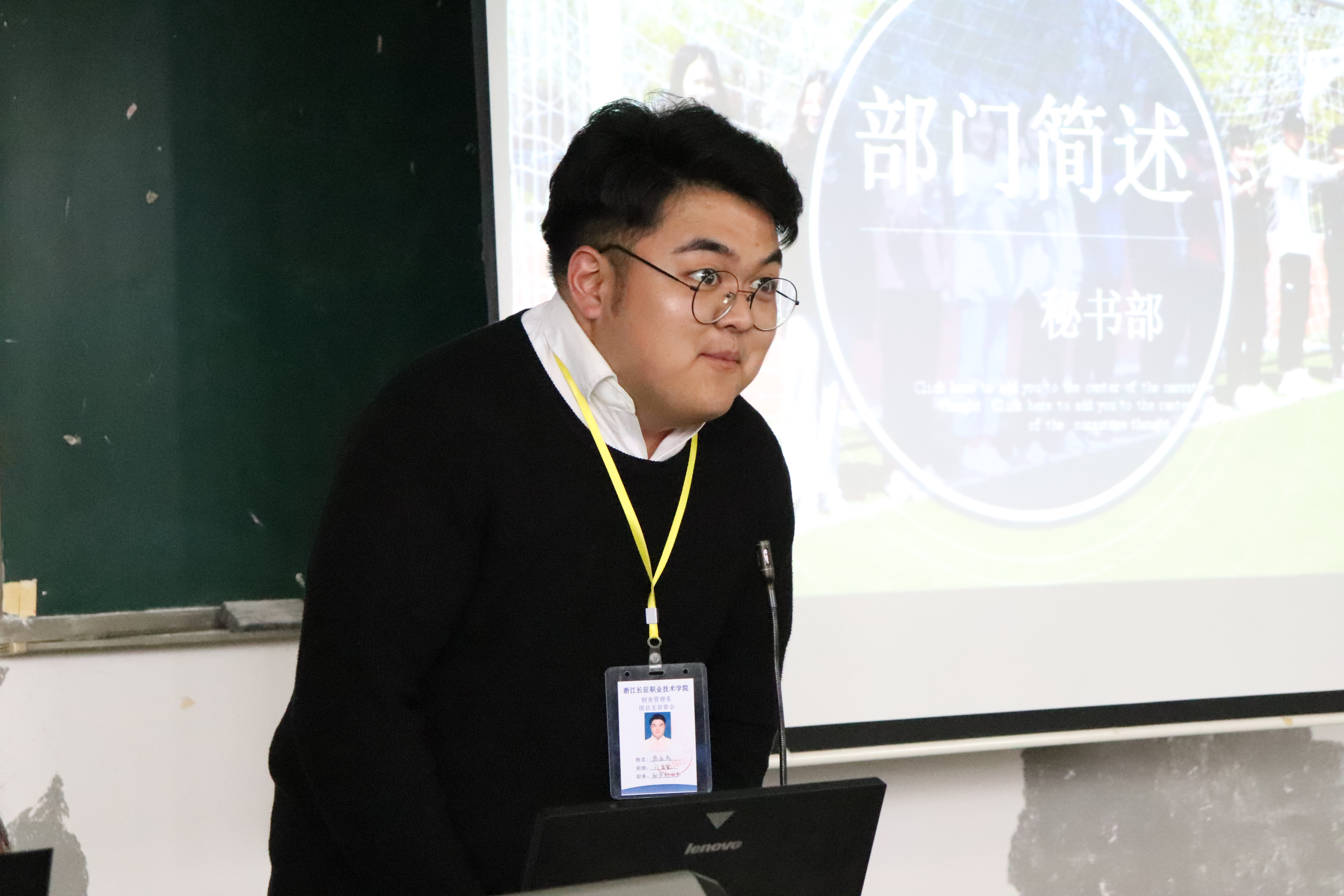 大会第三项,各部门汇报工作。首先由财管系团总支副书记张萌窈、宿管会主任潘宏健分别宣读《财管系团总支、学生章程》、《财管系“礼才文化”工作新机制》以及《财管系宿舍管理委员会章程》,为财管系团总支各部门开展工作树立了更高的标准。紧接着主席、副主席和其分管的各部门部长及副部长对过去一年工作进行了总结并对部门以后如何更好地开展工作进行阐述!