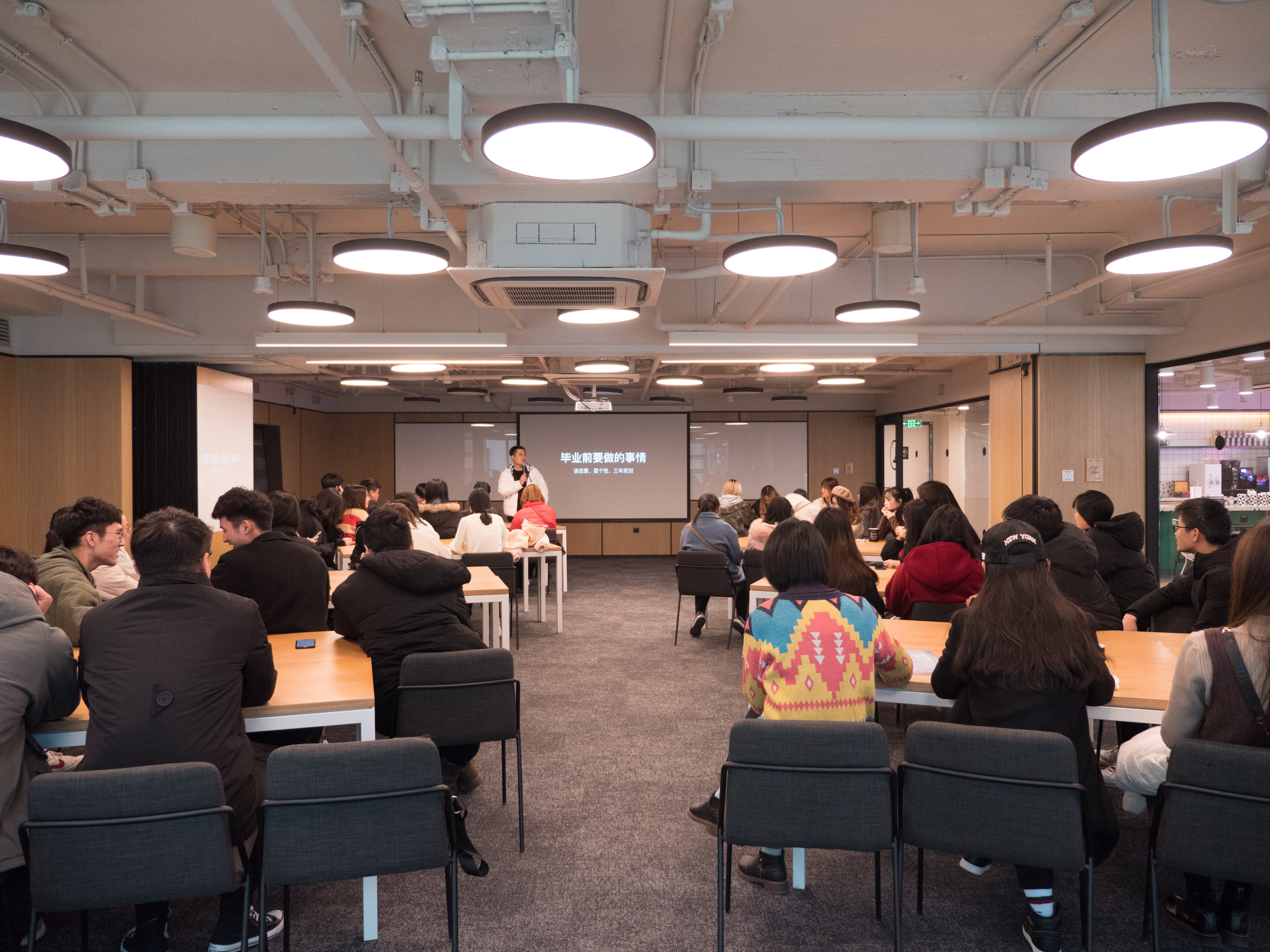 同学们首先参观了WeWork联合办公社区,开放式的创意公共休闲区、专属办公区域、公共办公桌、不同规模高科技的会议室等,直观地感受了全球社区联合办公的优势。接着公司的两位老总分别做了题为《大学生了没》的就业指导讲座。麦翔经理结合自身的学习、工作和生活经历帮助同学们正确认识自己的世界观、人生观和价值观,并引导大家积极思考毕业前自己想要什么、该干什么以及要学什么。同时,建议大家珍惜时间、珍惜老师和同学,学会自主学习,实现自我成长。沈鹏总经理从“与时间为友”和“人际关系学”的角度和同学们畅谈人生财富及职场的人际沟通。沈总侃侃而谈、诙谐幽默地从同学们的兴趣爱好引出珍惜时间的话题,再从以收割我们时间而成就事业的大咖们谈到专注力和注意力的宝贵,最后提出他的做人和成长理念:只有先使自己变得优秀才能遇到贵人,并一步一步地往上爬。期间,沈总还不时地介绍了一些培养文化修养、提升自我创造力、丰富人生的方法和途径。此外,更是分享了一些经典的职场人际交往语料。