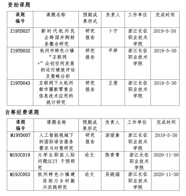 据《关于公布2019年度杭州市哲学社会科学规划常规性立项课题的通知》(杭社规〔2018〕23号),共有121项资助课题立项,6项学科共建课题立项,54项自筹经费课题立项。立项项目中,我校有6位老师主持的课题获得立项。其中,卜宁、平萍、王斐老师主持的课题获资助课题立项,汤丽拿、陈贵青、吴晓涵老师主持的课题获自筹经费课题立项。具体课题立项如下:
